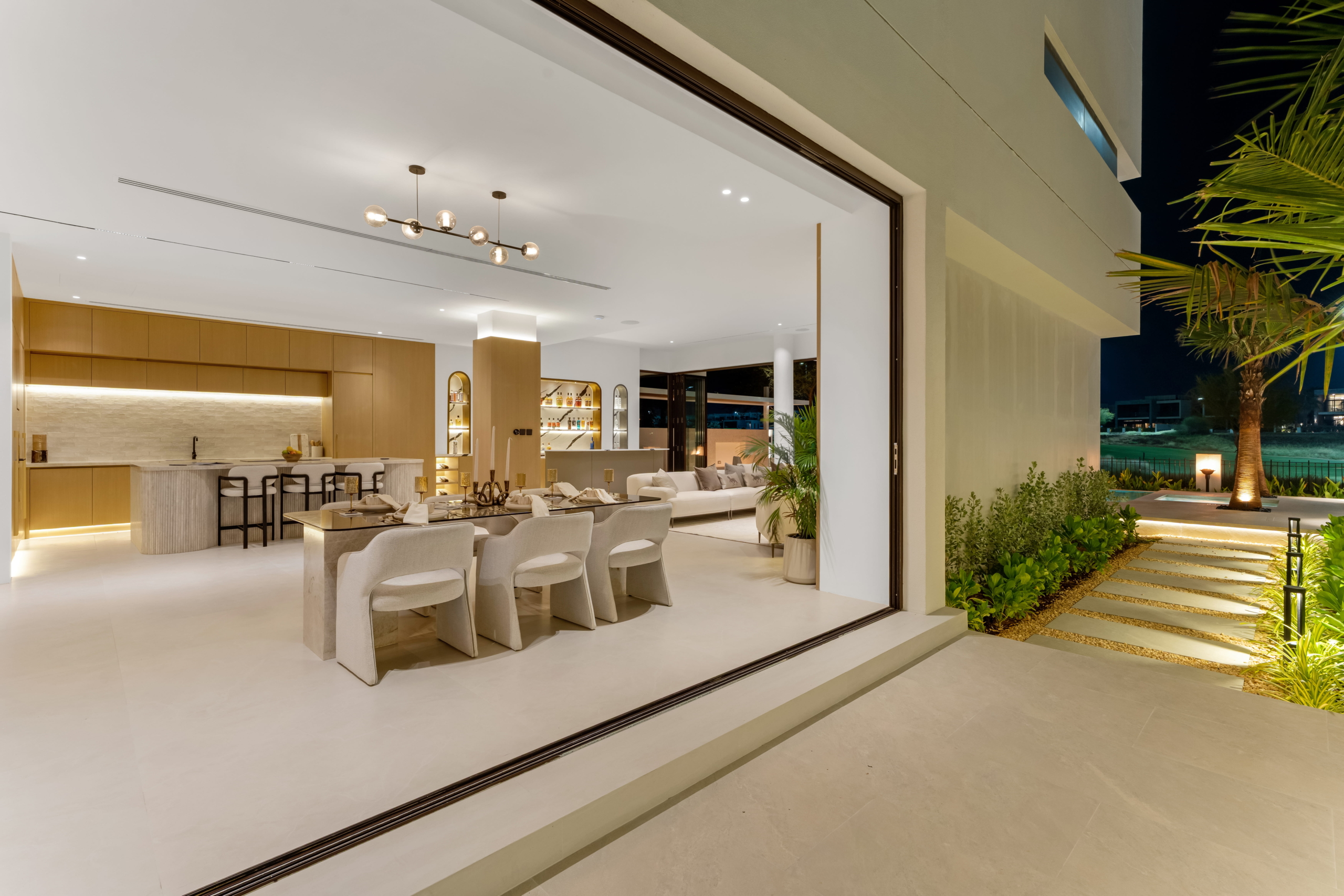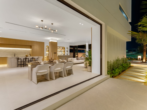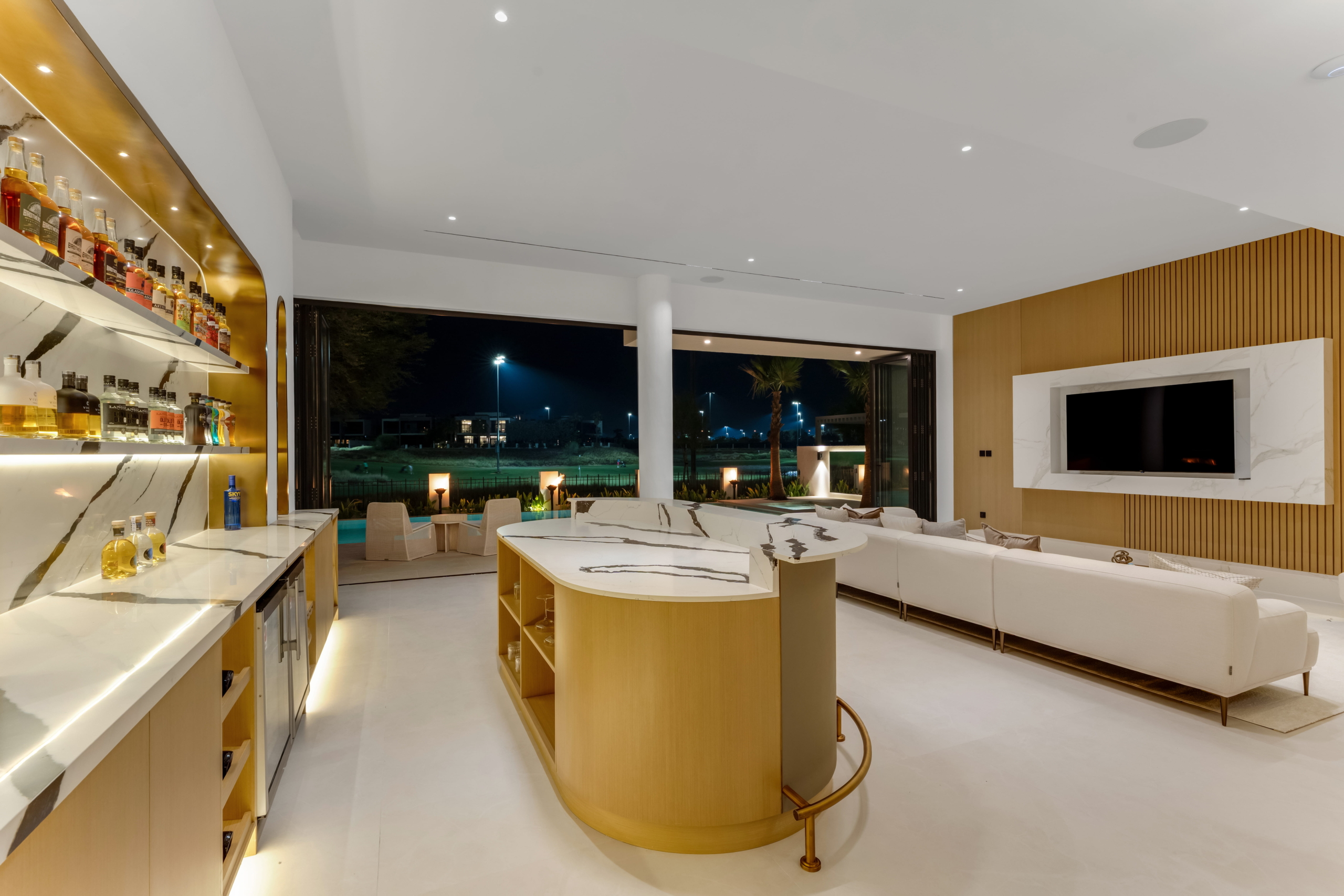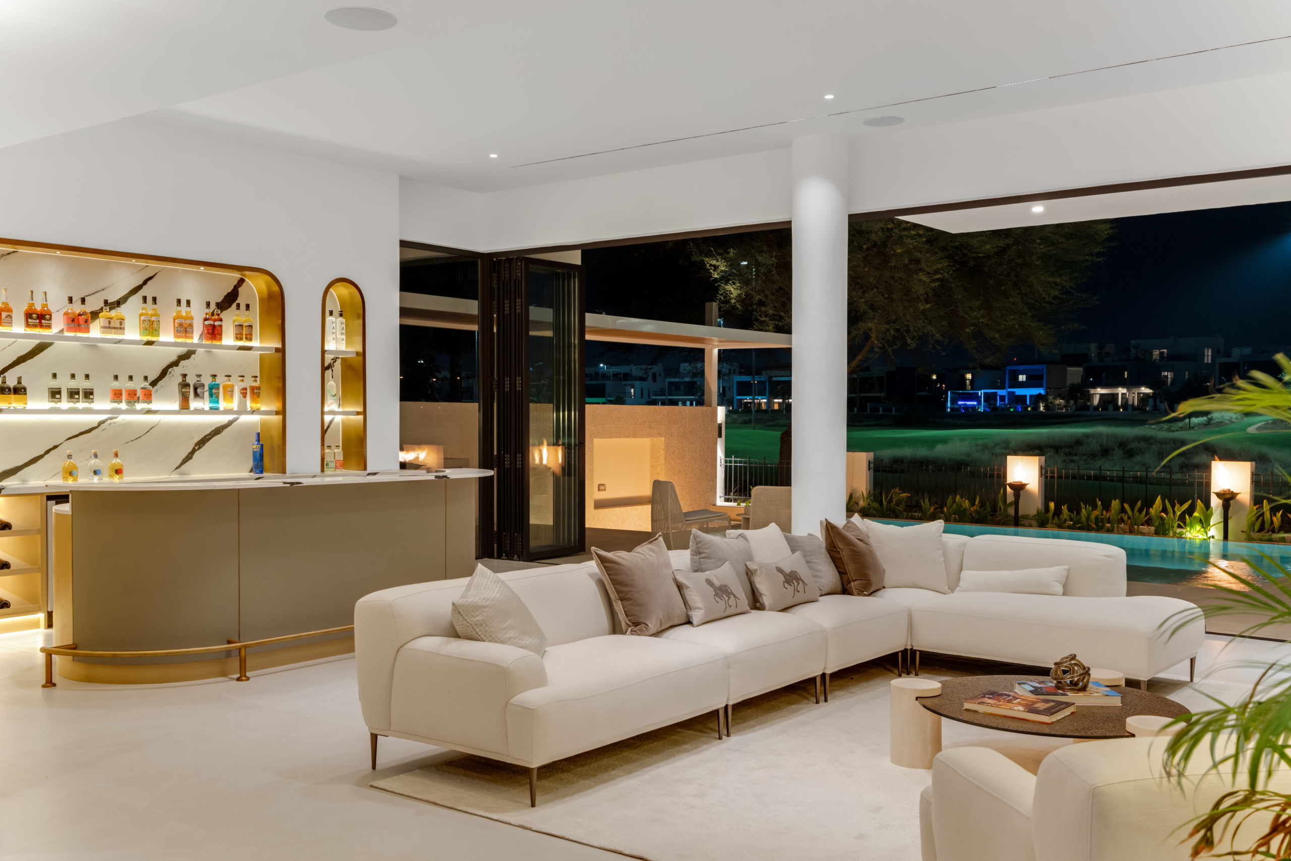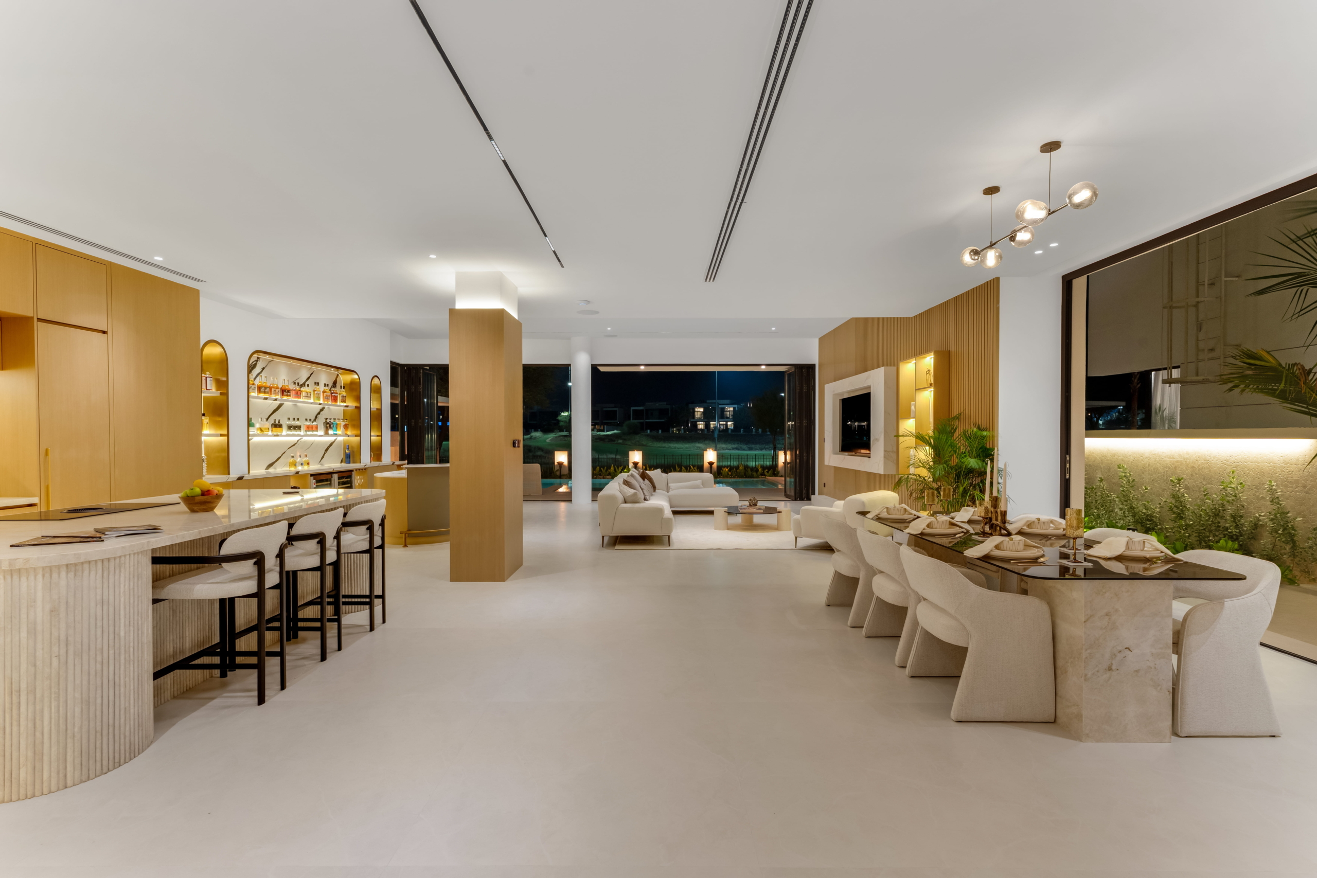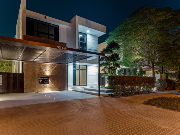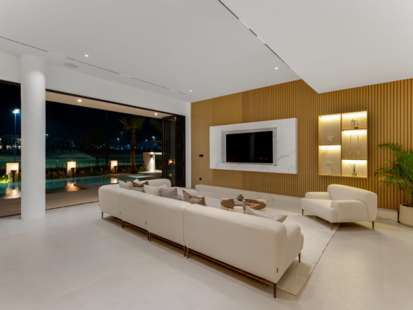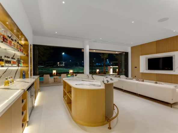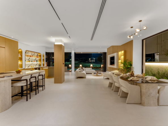 As you step through the grand entrance, you're greeted by an ambiance of refined comfort. The spacious living areas, adorned with contemporary finishes and designer touches, invite you to unwind in style. Floor-to-ceiling windows bathe the interiors in natural light while offering captivating views of the manicured greens beyond.